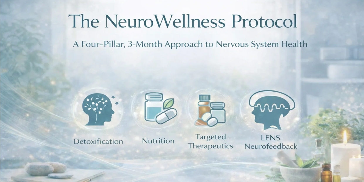 The NeuroWellness Protocol is a structured, three-month program designed to support nervous system regulation, cognitive clarity, and emotional resilience. Rather than focusing on isolated symptoms, this protocol addresses the underlying physiological and neurobiological factors that influence mental health, focus, mood, and stress response.